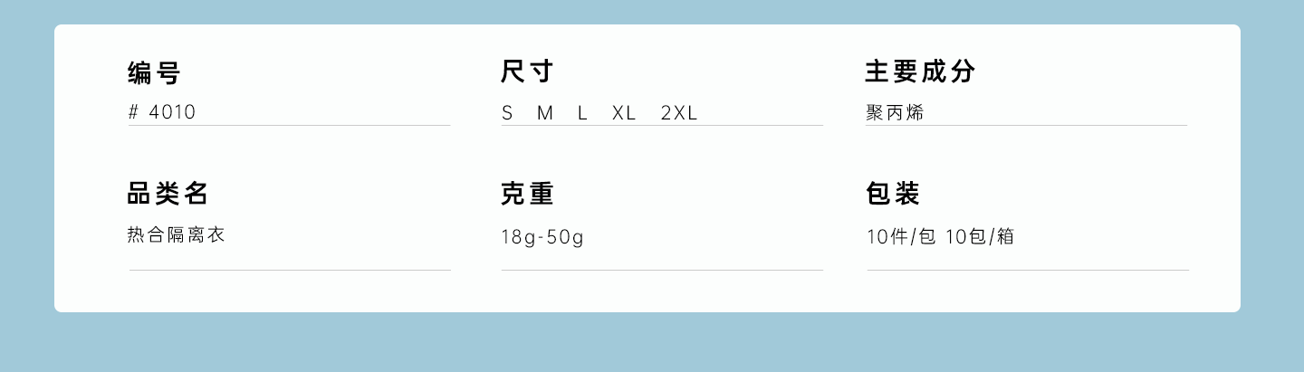 規(guī)格尺寸:S~2XL 主要成分:聚丙烯 克重:18g-50g 顏色:白色、黃色、藍色 工藝:熱合、橡筋袖口領(lǐng)口領(lǐng)帶、點焊腰帶 包裝:10件/包 10包/箱