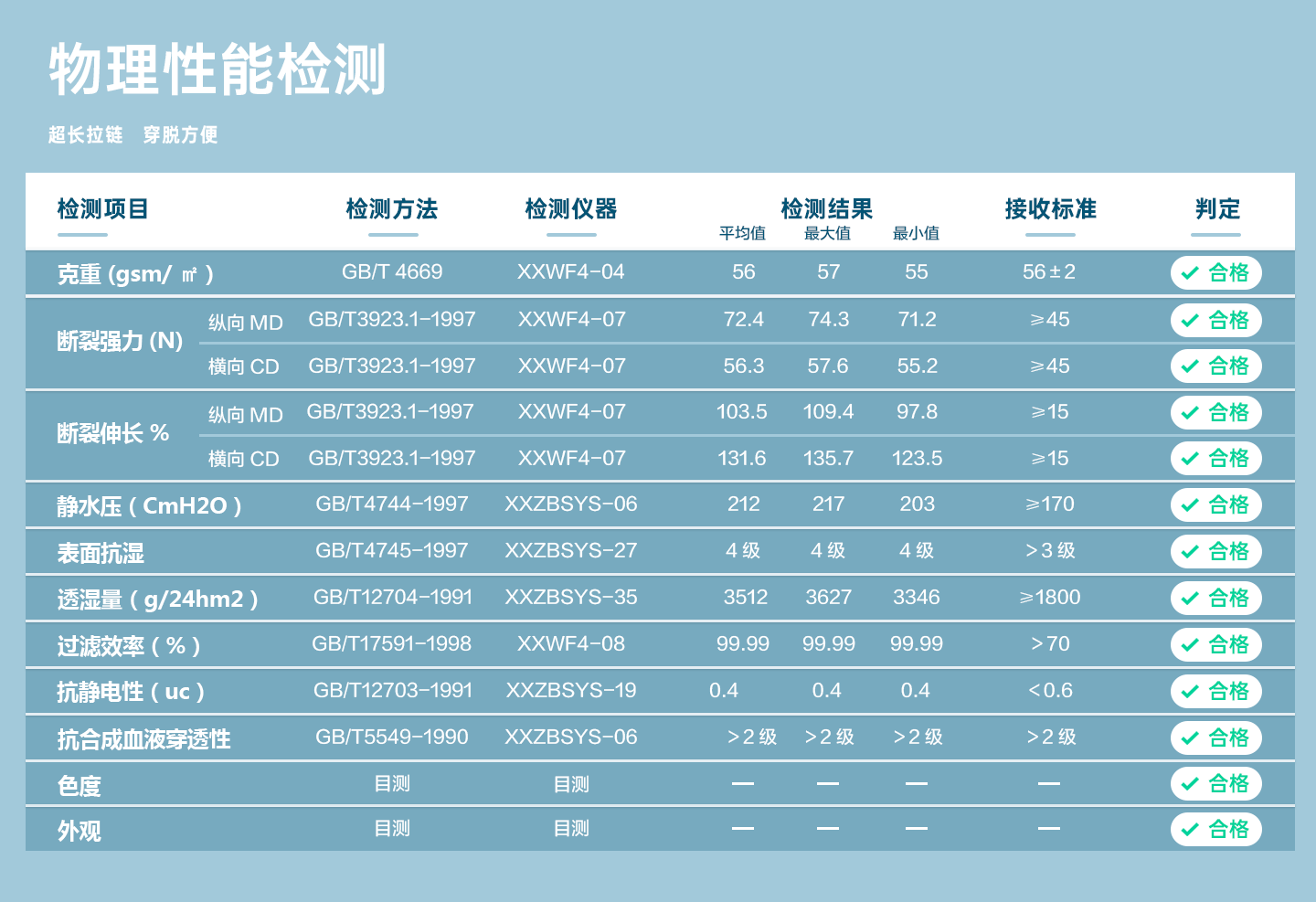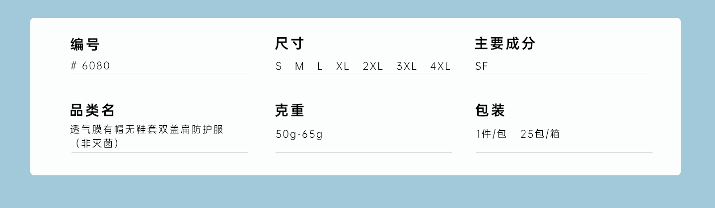 規(guī)格尺寸:S~4XL 主要成分:聚丙烯 克重:48g-65g 工藝:車縫、拉鏈無蓋扁、有帽無鞋套 包裝:1件/包 25包/箱