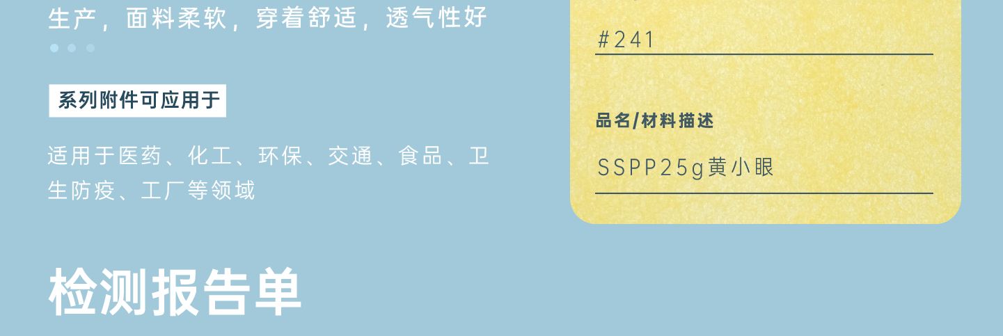 主要成分:紡粘聚丙烯無紡布 克重:25g 顏色:黃色 產(chǎn)品用途:適用于醫(yī)藥、化工、環(huán)保、交通、食品、衛(wèi)生防疫、工廠等領(lǐng)域