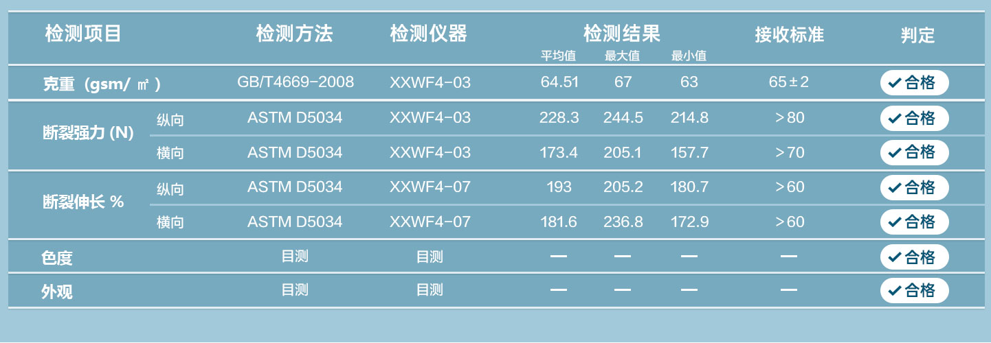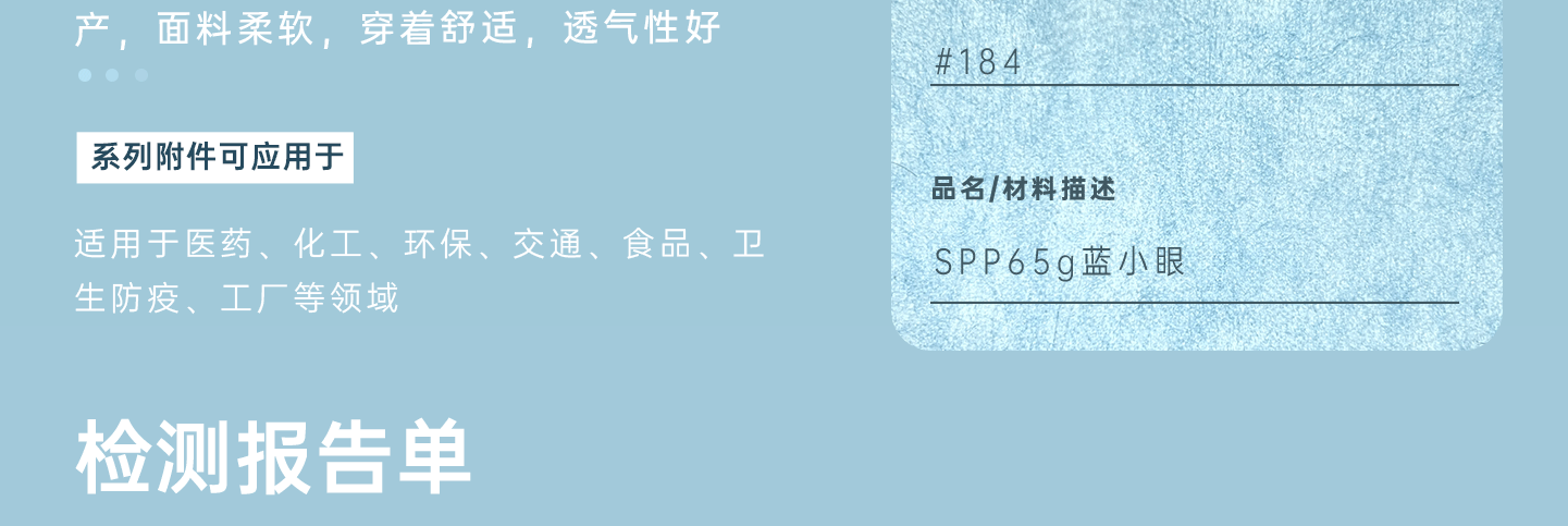 主要成分:聚丙烯 克重:65g 顏色:藍(lán)色 產(chǎn)品用途:適用于醫(yī)藥、化工、環(huán)保、交通、食品、衛(wèi)生防疫、工廠等領(lǐng)域。