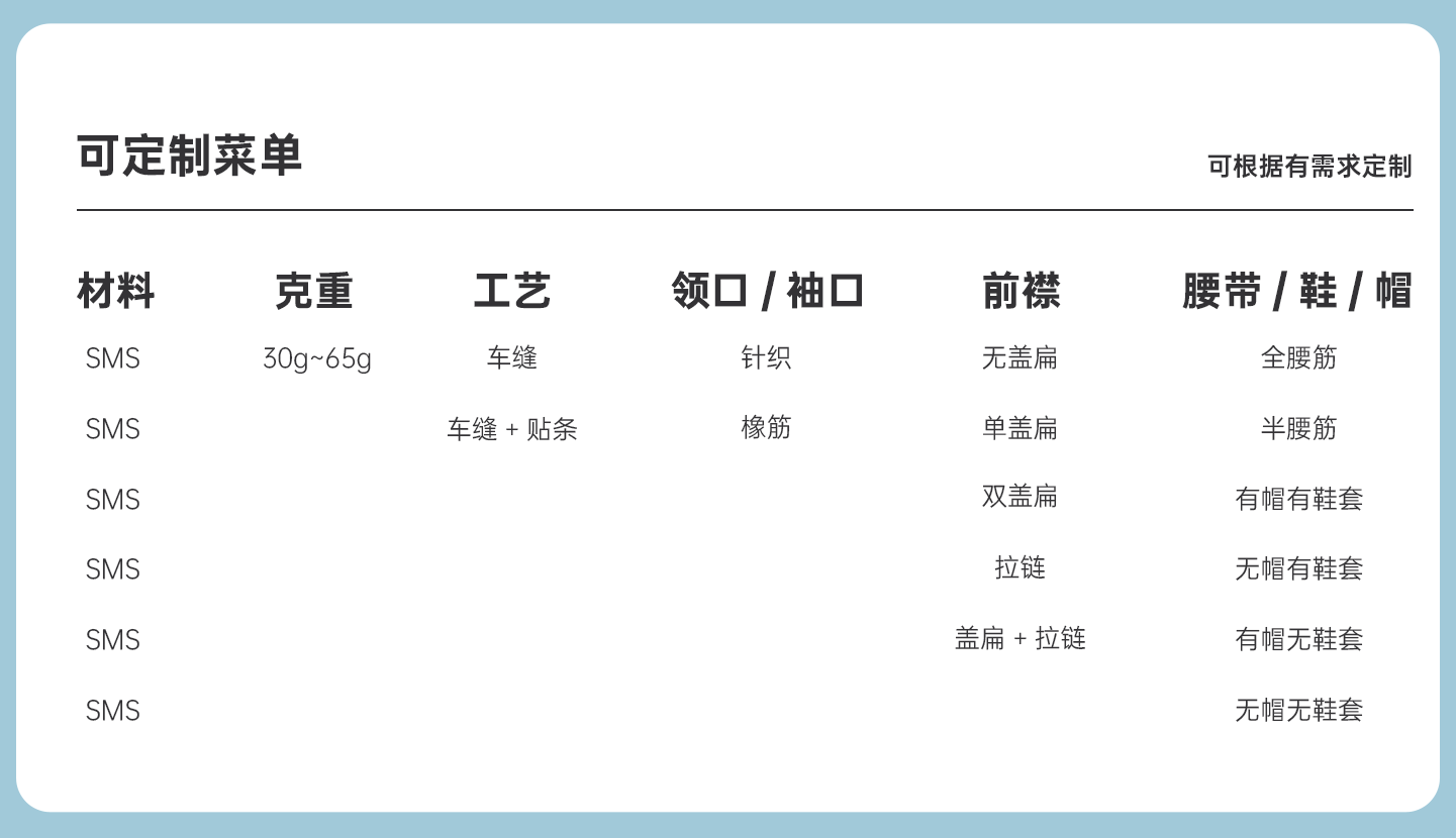 規(guī)格尺寸:S~4XL 主要成分:聚丙烯+透氣膜 克重:50g-65g 工藝:車縫、拉鏈雙蓋扁貼條、有帽有鞋套 包裝:1件/包 25包/箱