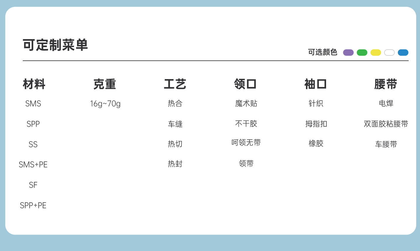 規(guī)格尺寸:S~2XL 主要成分:聚丙烯 克重:18g-50g 顏色:白色、黃色、藍色 工藝:熱合、橡筋袖口領(lǐng)口領(lǐng)帶、點焊腰帶 包裝:10件/包 10包/箱