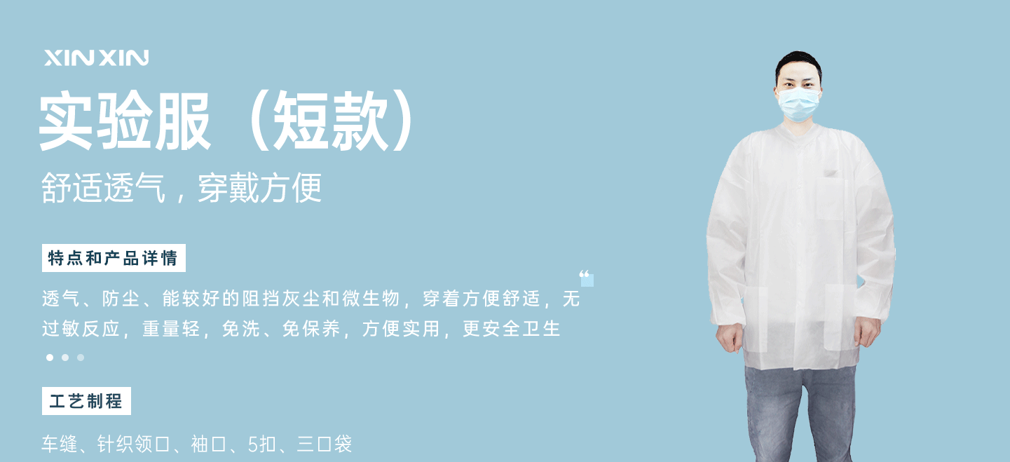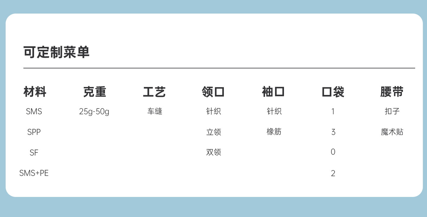 規(guī)格尺寸:S~2XL 主要成分:聚丙烯 克重:25g-50g 顏色:白色、藍色、深藍、淺藍、紫色 工藝:車縫、針織領口、袖口、5扣、三口袋 包裝:10件/袋 10袋/箱