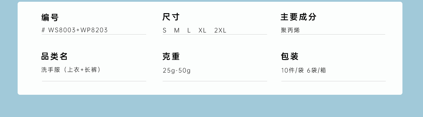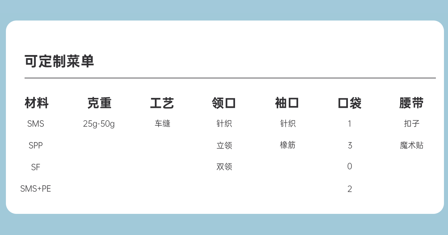 規(guī)格尺寸:S~2XL 主要成分:聚丙烯 克重:25g-50g 顏色:白色、藍色、深藍、淺藍、紫色 工藝:車縫、1口袋、圓領(lǐng) 包裝:10件/袋 6袋/箱